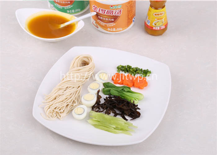 2.鍋內(nèi)加水,燒開后加入金鑼原汁豬骨高湯、金鑼原汁雞骨高湯、蒜香調(diào)味油、食鹽、金鑼雞汁,再次煮沸后備用;
